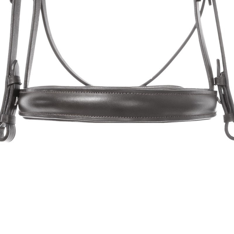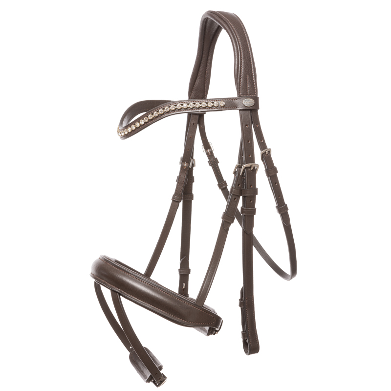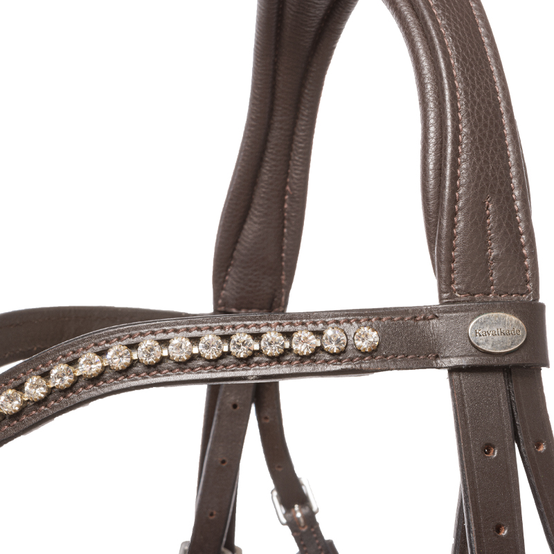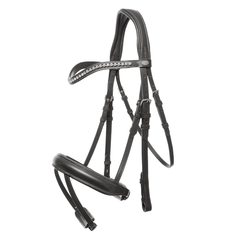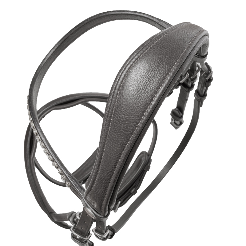 The wide, anatomically shaped headpiece and softly padded noseband ensure an exceptionally comfortable fit, reducing pressure around sensitive areas. The angled throat lash provides a sleek look and a stable fit, while the curved browband set with white rhinestones adds a touch of understated sparkle.