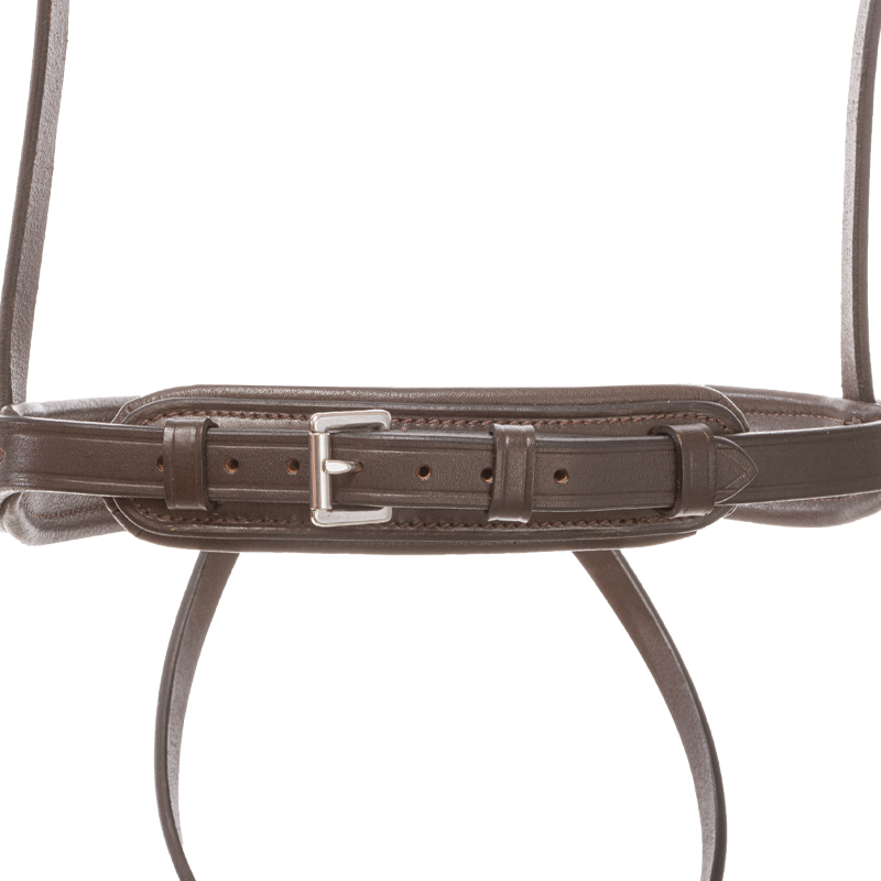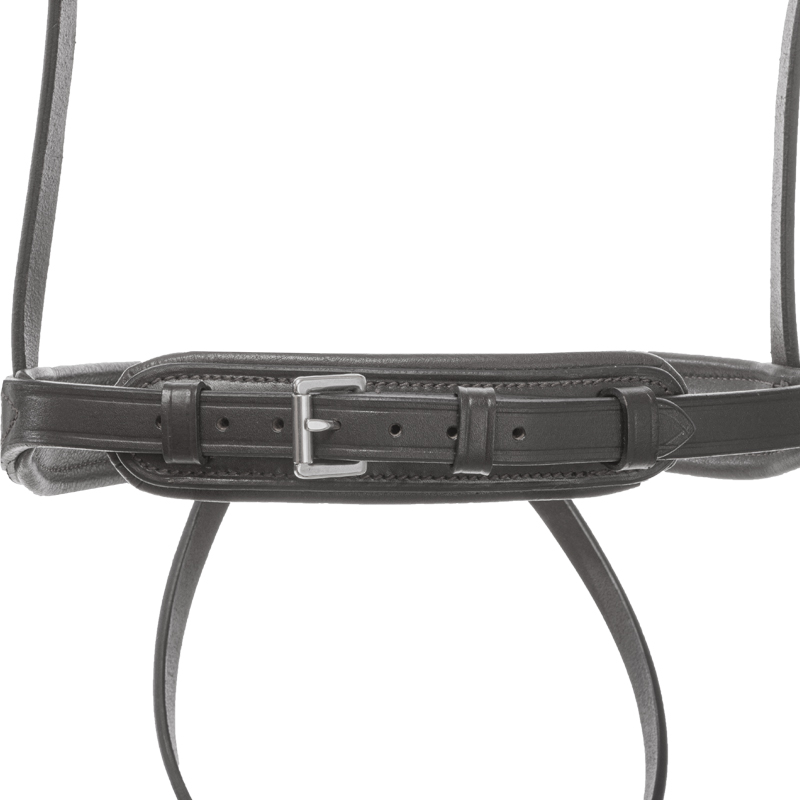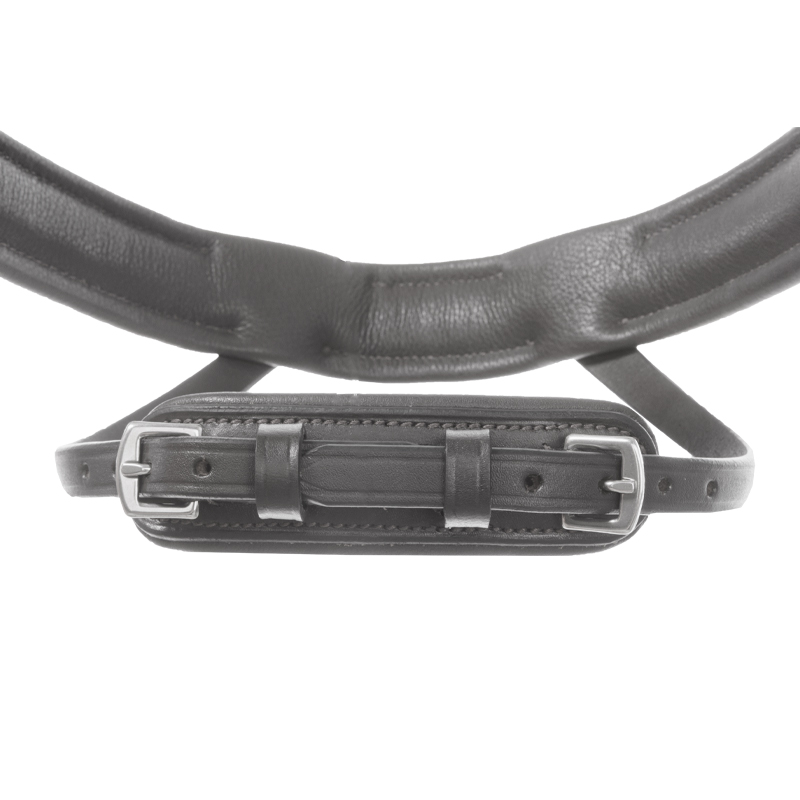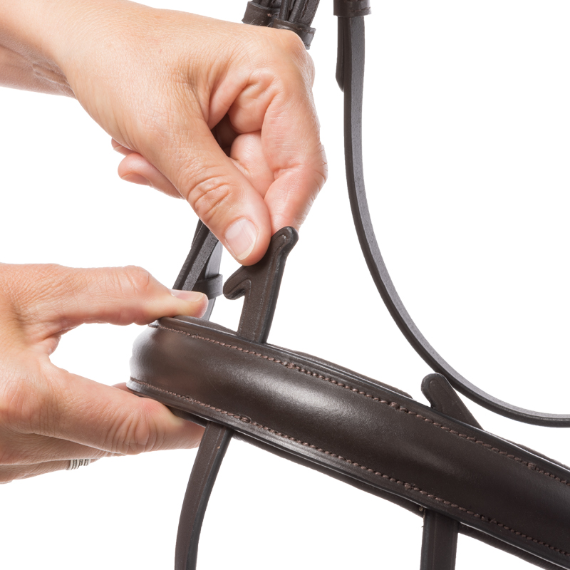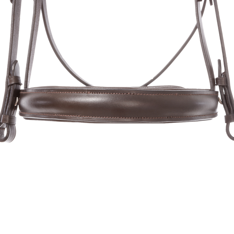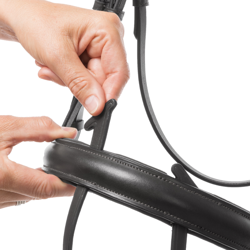 The wide, anatomically shaped headpiece and softly padded noseband ensure an exceptionally comfortable fit, reducing pressure around sensitive areas. The angled throat lash provides a sleek look and a stable fit, while the curved browband set with white rhinestones adds a touch of understated sparkle.